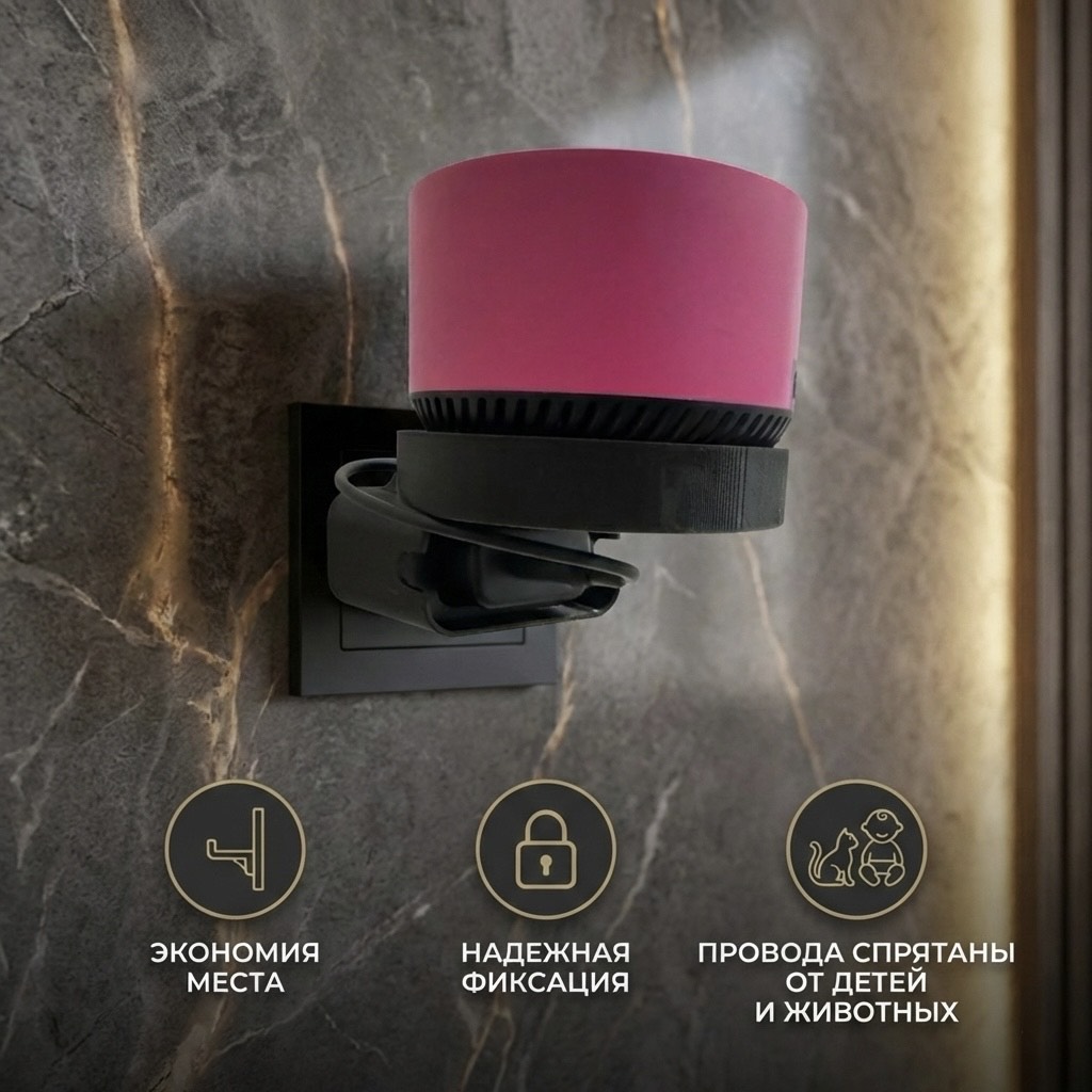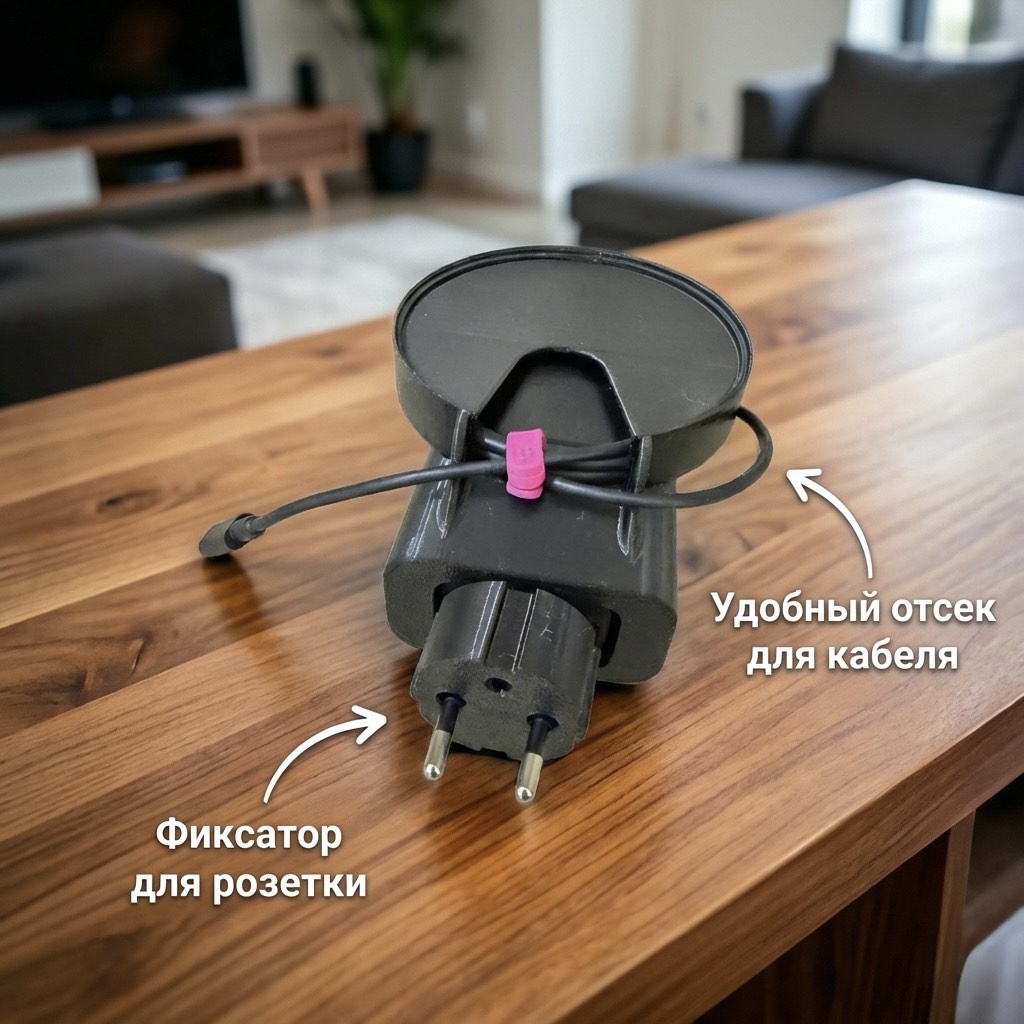 Практичное крепление, позволяющее разместить умную колонку прямо на розетке. Держатель освобождает место на тумбочке или столешнице и избавляет интерьер от визуального шума. Конструкция предусматривает отсек для скрытой намотки лишнего провода, чтобы снаружи оставалась только сама станция.