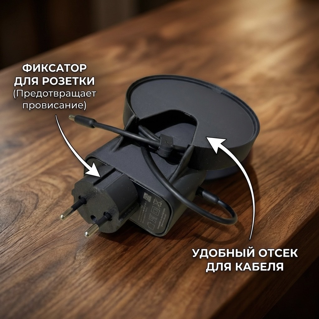 Умное решение для установки вашей Яндекс Станции. Этот компактный держатель позволяет закрепить колонку прямо у розетки, избавляя вас от висящих проводов. Специальная система скрытого кабель-менеджмента аккуратно прячет лишний шнур и блок питания внутри корпуса подставки, сохраняя интерьер чистым и опрятным.